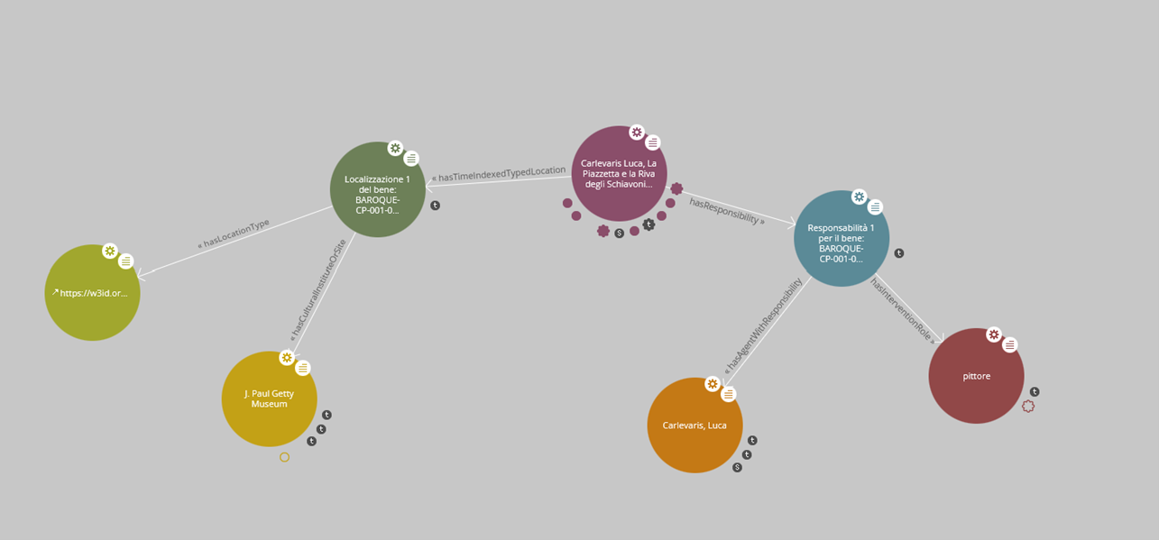 In particolare, la modellazione restituisce informazioni relative alla localizzazione fisica attuale dell’opera (Paul Getty Museum di Los Angeles) e all’attribuzione di responsabilità, che individua Luca Carlevaris nel ruolo di pittore.