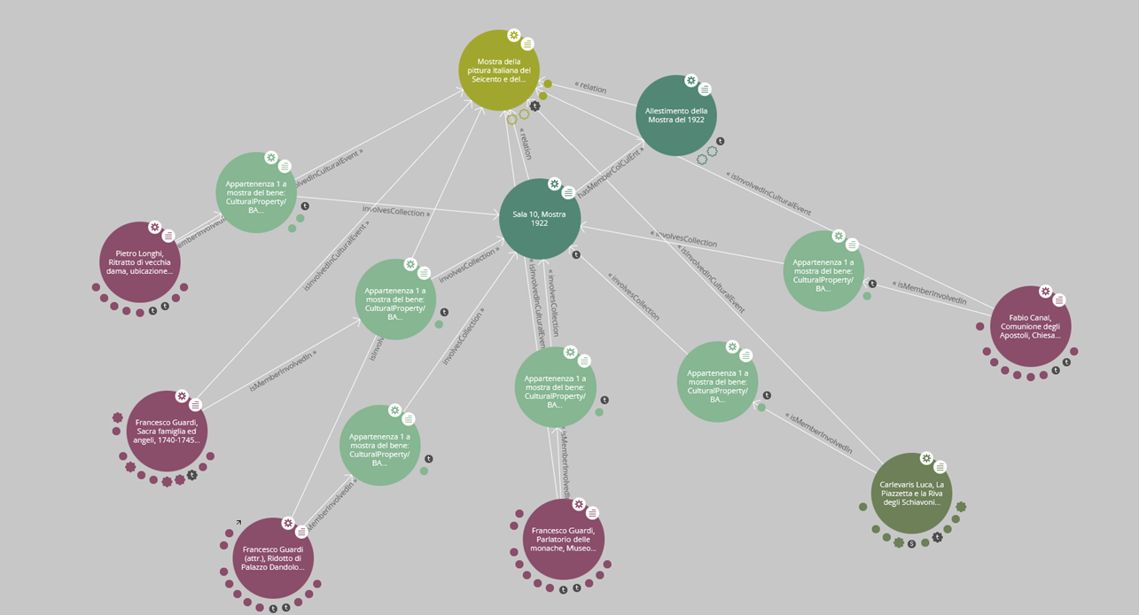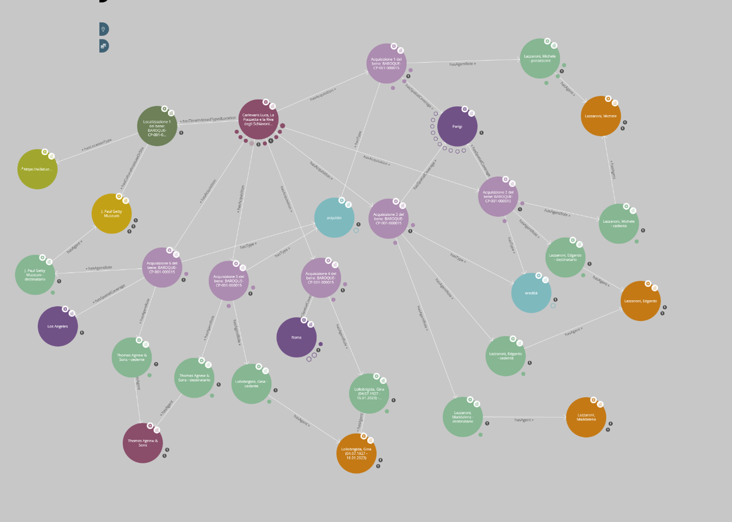 La strutturazione dello spazio dati è partita dal concetto base e qualificante per i fini della ricerca di descrizione dell’opera nel tempo, cioè la registrazione di come le opere esposte nella Mostra della pittura italiana del Seicento e del Settecento abbiano attraversato mostre, musei, collezioni, bibliografia, mercato modificandosi nella fortuna critica, attribuzioni, proprietà, autenticità. Si è così definito un sistema – un grafo – di concetti (entità) interconnessi e dipendenti, mappati con classi e proprietà afferenti alle ontologie di settore o modellate ad hoc quando non già esistenti. A questa struttura ontologica si riconducono le risorse, cioè i dati derivati dalla ricerca primaria, organizzate in relazioni semantiche generando così una struttura aperta che si espande dall’opera d’arte – il punto di partenza del progetto – alla ricomposizione di esposizioni temporanee, di collezioni private e museali, alla fortuna critica letta attraverso le mostre, la letteratura scientifica, i passaggi di proprietà, tutti nodi concettuali che diventano a loro volta porte di accesso per esplorare le risorse.